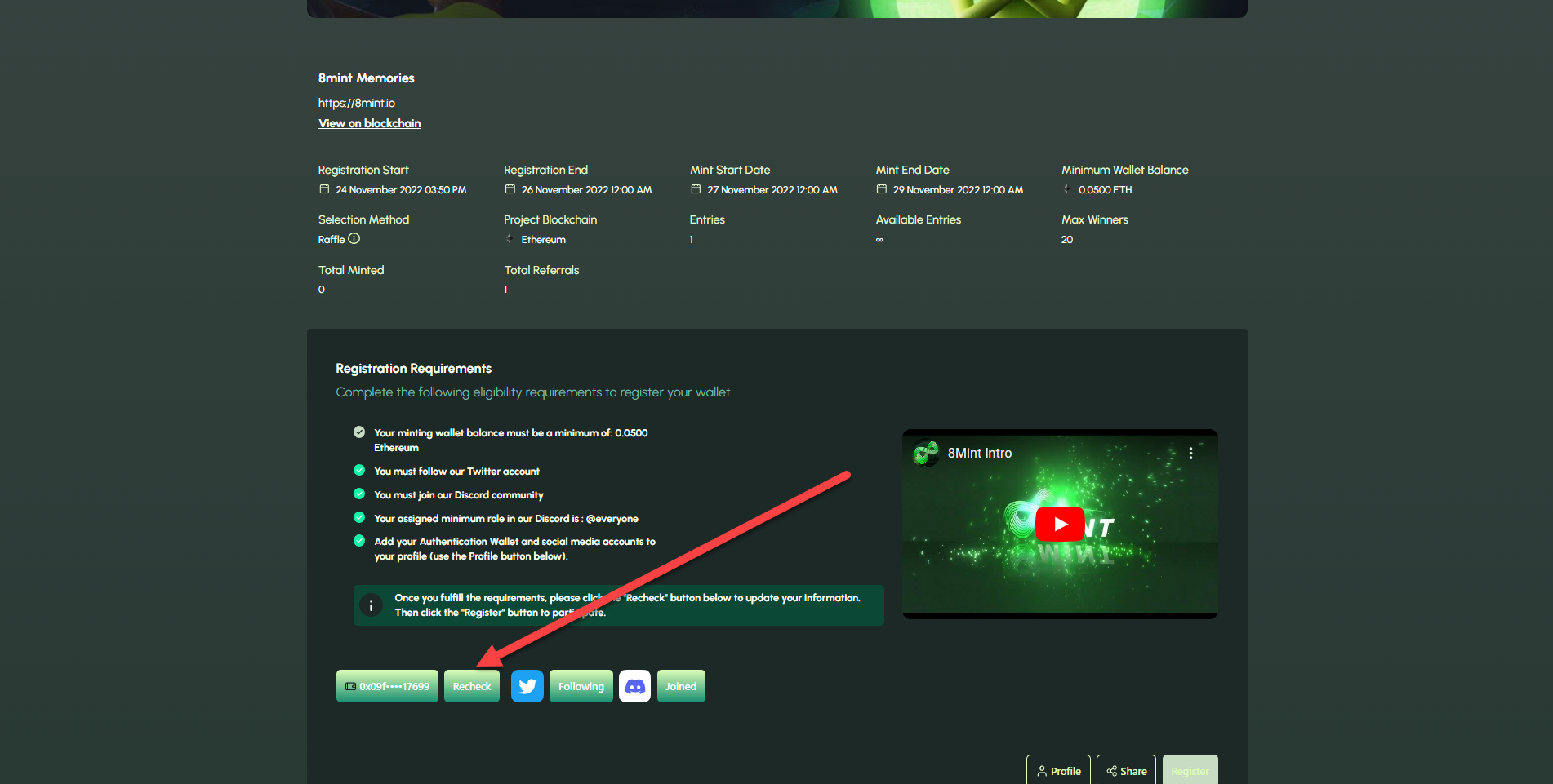 ***Step 4:*** Once you fulfill all the requirements, click the "Recheck" button to update your information within the 8mint dApp.