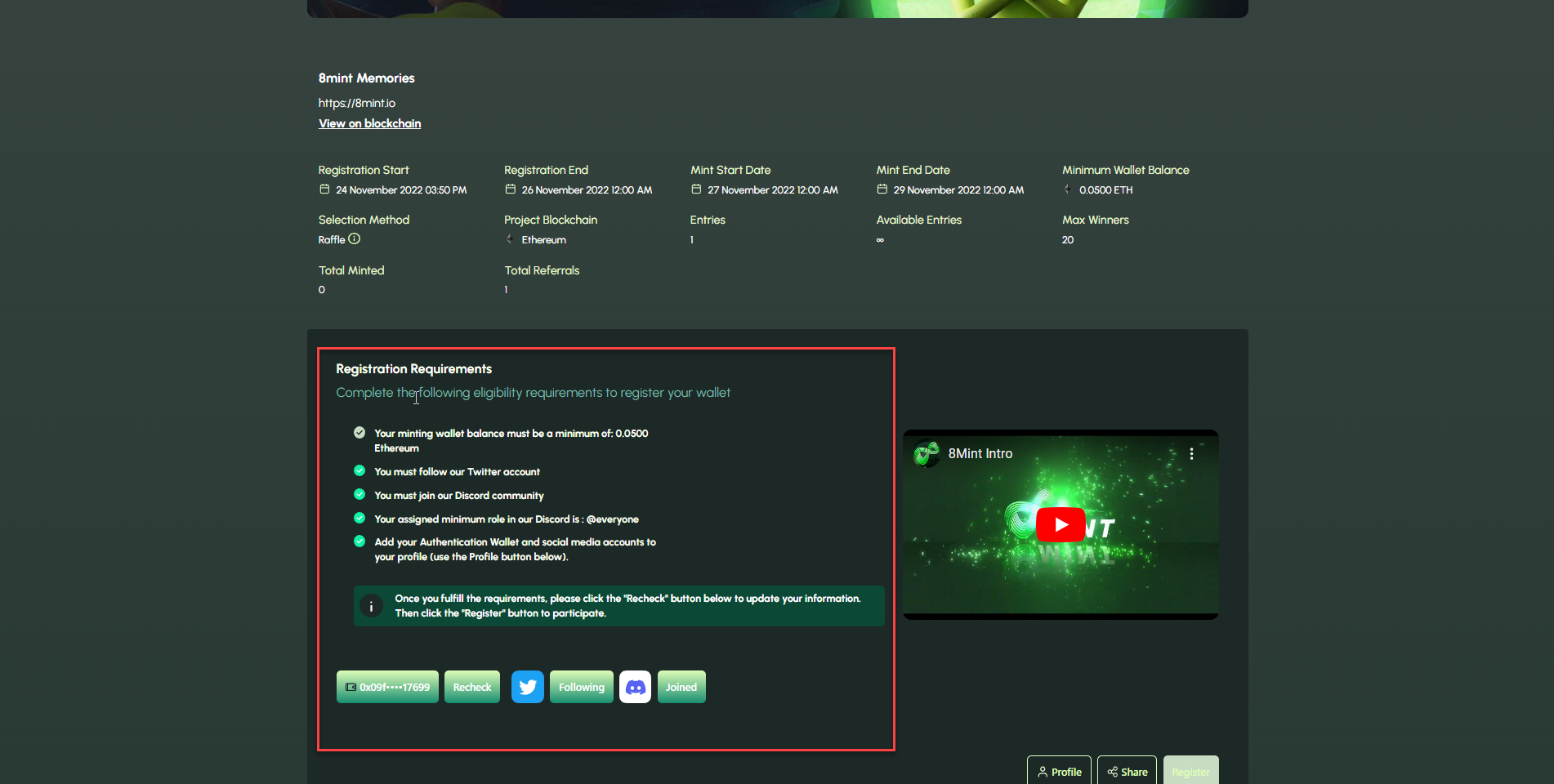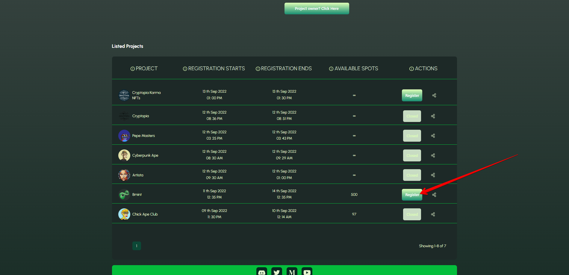 ***Step 1:*** Go to the project dashboard on 8mint's homepage and click on the "Register" button for the project whose raffle you want to participate in.