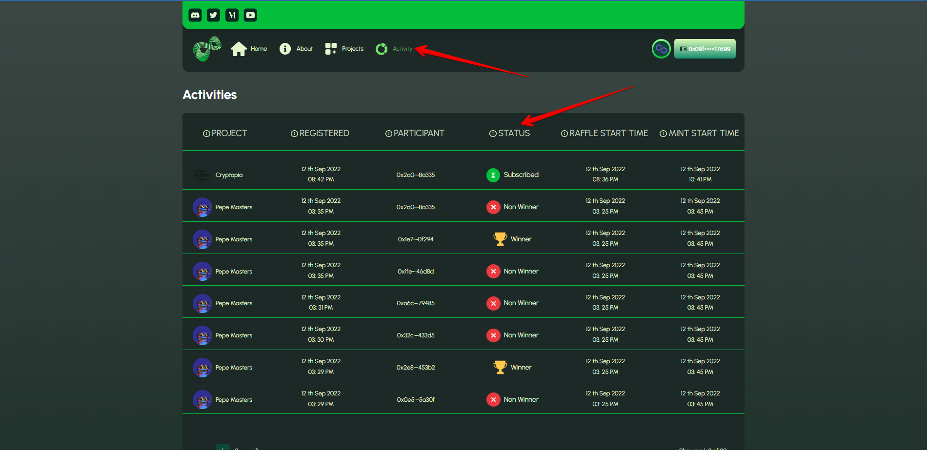 Note that you can check the status of the projects you are registered with in the "Activity" tab.